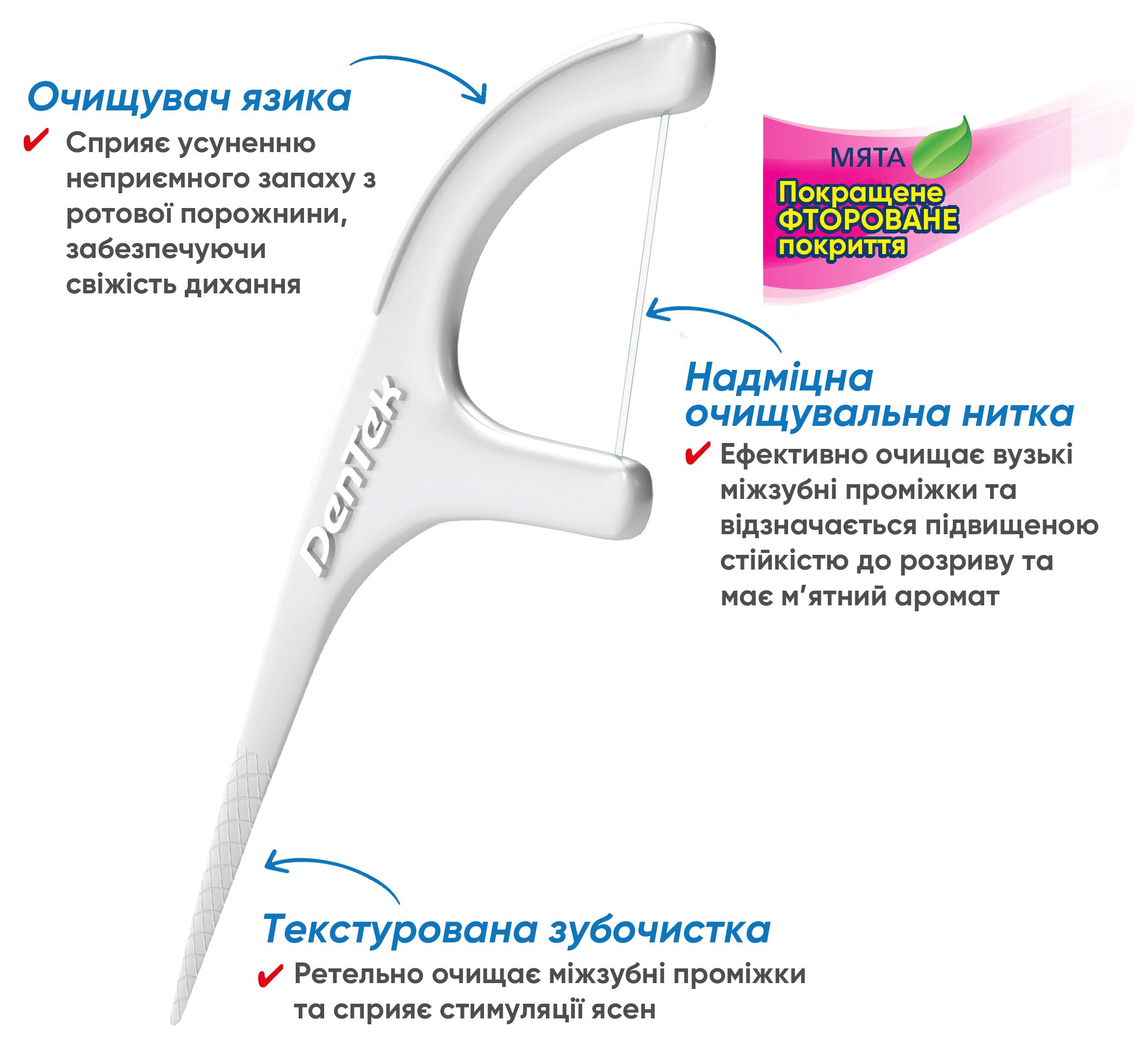 DenTek® Потрійне очищення Флос-зубочистки – це потрійний очищаючий ефект в одній флос-зубочистці.