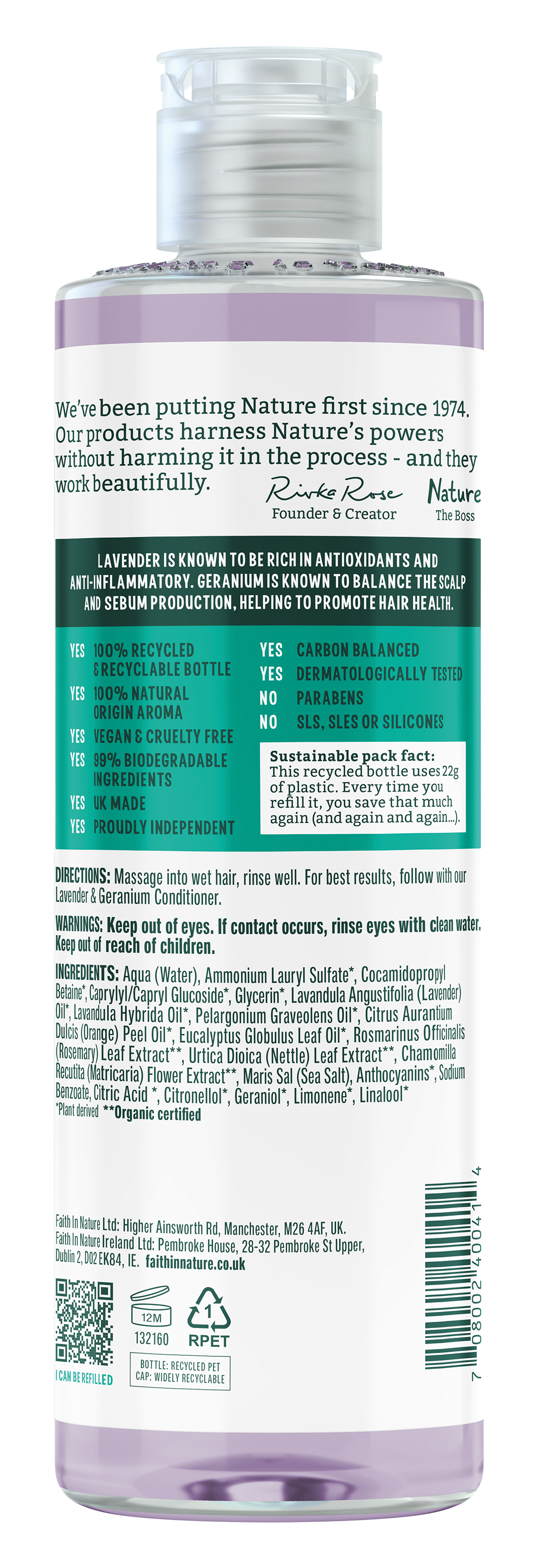 Наш живильний шампунь з лавандою та геранню з лінійки натуральних шампунів Faith In Nature, усі з яких багаті на антиоксиданти, вітаміни та мінерали, схвалені The Vegan Society, не тестуються на тваринах і виготовлені з інгредієнтів найвищої якості природного походження.