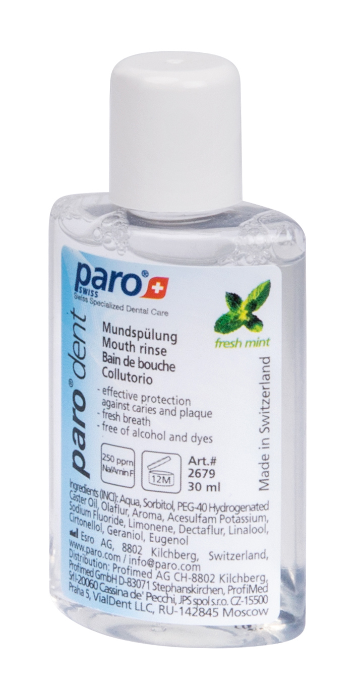 paro® dent ополіскувач містить комбінацію амінофториду та фториду натрію. Ці активні інгредієнти запобігають виникненню карієсу, зміцнюють зубну емаль та знижують утворення зубного нальоту. Надовго зберігає свіжість дихання. Не містить спирту та барвників.