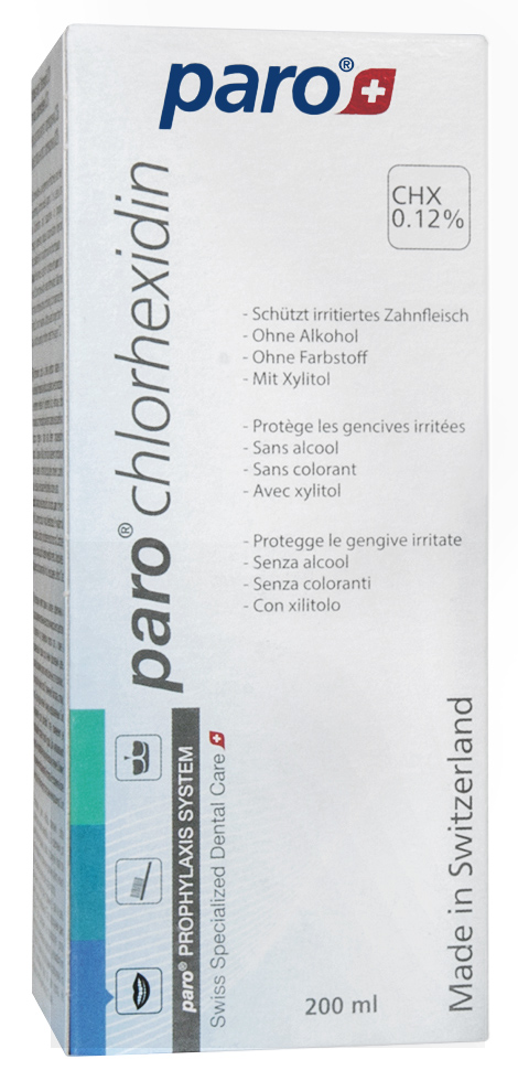 Ополіскувач ротової порожнини paro® з хлоргексидином (0,12% СHX) доповнює щоденну гігієну порожнини рота, не містить спирт і барвників; надає свіжості дихання.